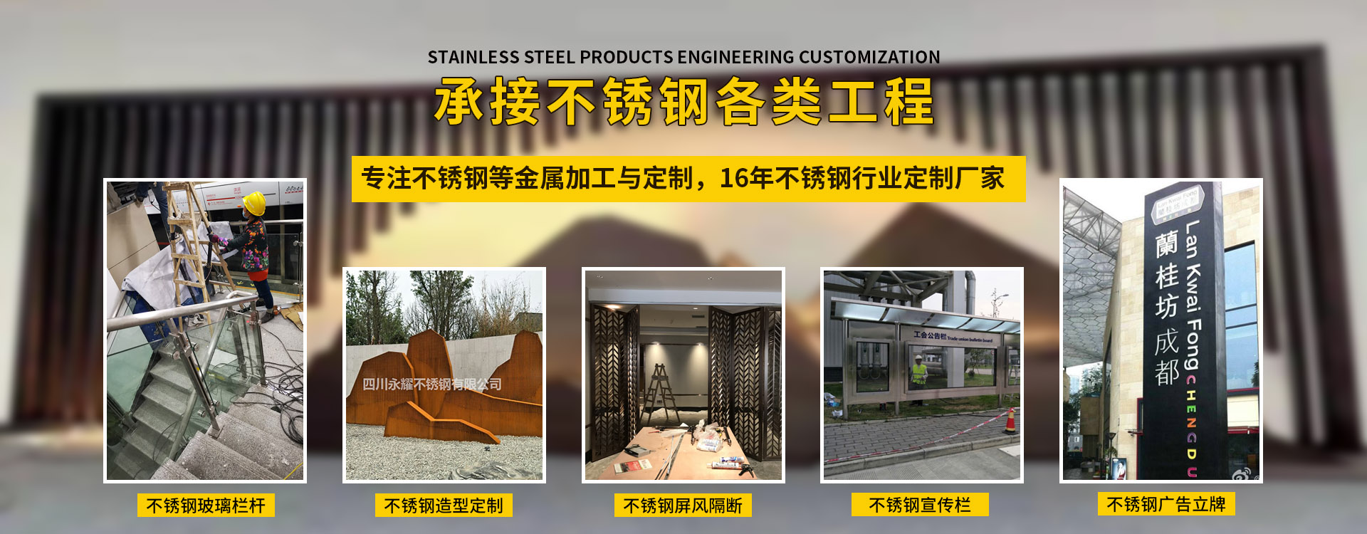 四川永耀不銹鋼有限公司是一家集開發(fā)、設(shè)計(jì)、加工、制作、安裝、并承接各種不銹鋼工程為一體的綜合性企業(yè)。多年來一直在專注于不銹鋼等金屬的加工與研發(fā)。在客戶群體中贏得了良好的聲譽(yù),以專業(yè)專注的精神,致辭力于打造良好的產(chǎn)品和企業(yè)形象,對每一產(chǎn)品傾注全力,力爭每個細(xì)節(jié)精細(xì),確保產(chǎn)品具有優(yōu)越的性能,優(yōu)美的外觀及優(yōu)良的品質(zhì),使公司產(chǎn)品深受廣大用戶的親睞。